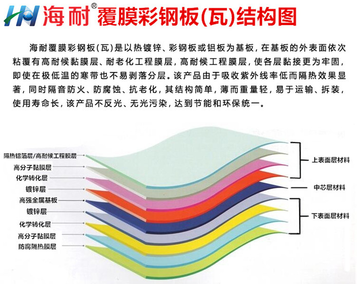 海耐覆膜彩鋼板(咨詢:0510-83326008)可以任意壓型、折彎、沖壓造型,可為建筑設計師提供無限創意空間,建造美麗獨特的建筑外衣、內飾、創造完滿的視覺效果。海耐覆膜彩鋼板安全可靠:所有部件均采用鋼性連接,可抗強臺風襲擊。重量輕便:對鋼構的承重要求降低,施工難度小。易安裝:安裝方便,縮短施工周期,節約工程造價。隔熱效果高:高熱反射率使產品表面不吸熱,即使在夏天板面也不燙手,使建筑物內溫度降6-8度。防腐性強:為高污染企業節約大量的人力、物力成本。自潔性高:具有抗靜電功能,表面光潔無須經常清洗。壽命久遠:表面質量可靠,內在質量始終如一。環保性強:表面凹凸紋使產品不反光,無光污染、消防性好:絕然、絕緣,金屬基板具有A級阻燃性能。耐候性強:在零下-20°C至 60°C的范圍內均適用。它以鍍鋅鋼板或鋁板為基板,在基板的外表面可選擇性粘履有鋁箔層、耐老化高分子膜層,外表的耐老化膜層上有壓紋,采用高分子膠合膜粘接,使各層粘接更為牢固,即使在極低溫的寒帶也不易剝落分層。